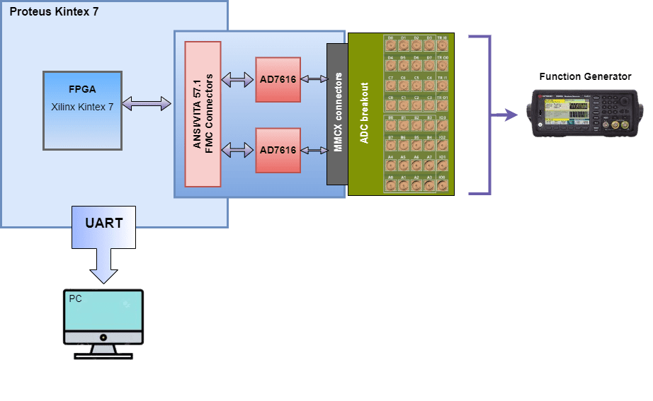 The above block design shows the hardware configuration, in which the FMCADCX002 is linked to the Numato Lab Proteus Kintex 7 FPGA Board through the FMC connections, which contain the 2 AD7616 ICs. To access the function generator’s output, a separate ADC breakout is used.