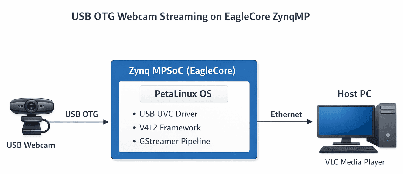 In this project, we turn the EagleCore ZU-Plus FPGA Development Board into a live webcam streaming machine. Using a regular USB webcam connected through USB OTG, the board captures video, processes it under PetaLinux, and streams it in real time to a PC over Ethernet using GStreamer.