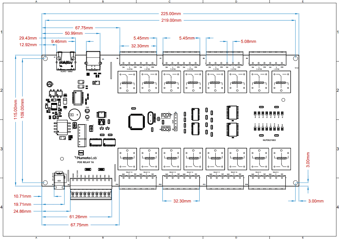 - 16 onboard 12V SPDT Relays (10A) with individual LEDs for status