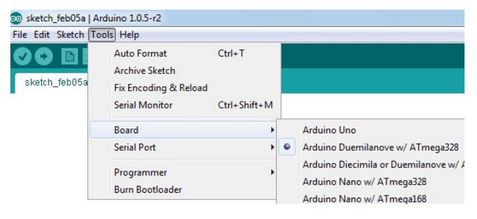 7. Select the Board “Arduino Duemlanove w/Atmega328 board” from tools menu. (see the image below).