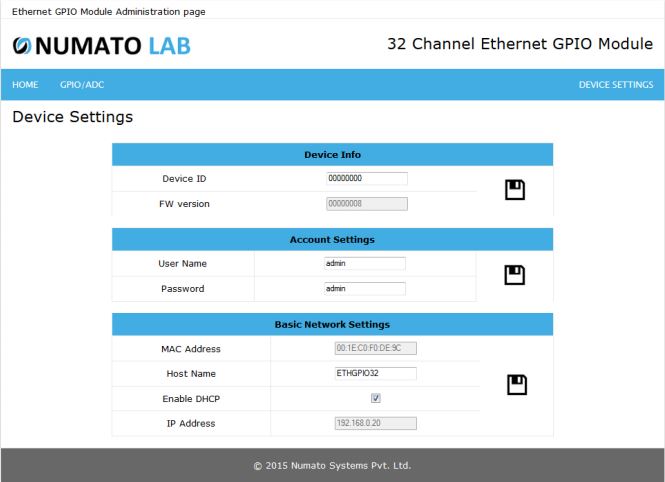 In the above image, firmware version is displayed as 00000008, default device ID 00000000, default User name and Password as ‘admin’. The user can change and save the Device ID, User name and Password as explained in command set or changing the appropriate field on this page and clicking on the save button on right side. The User name and Password can be reset to factory defaults via Factory Reset explained elsewhere in this document. The Basic Network Settings Shows the Device MAC address, Host Name and IP Address. The default host name and IP Address can also be changed according to the user wish. After saving changes the board will reboot with the new network settings.