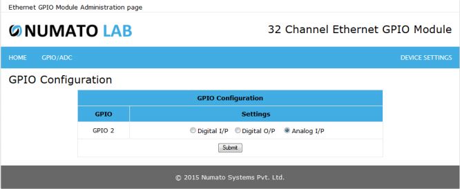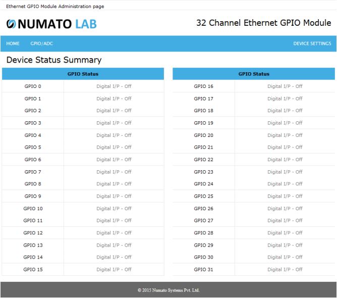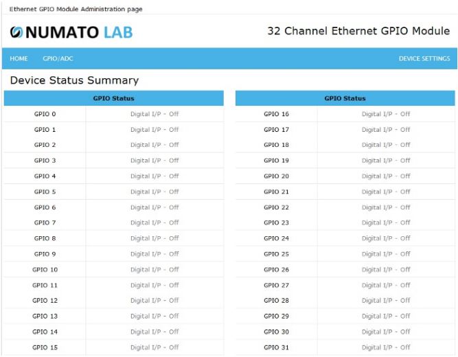 This board has 32 general-purpose input/outputs among 14 multiplexed with analog input. Click on the GPIO/ADC link on the menu bar to access GPIO configuration page. The GPIOs can be turned on/off by clicking on the Toggle GPIO button next to the corresponding GPIO.