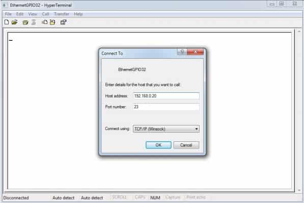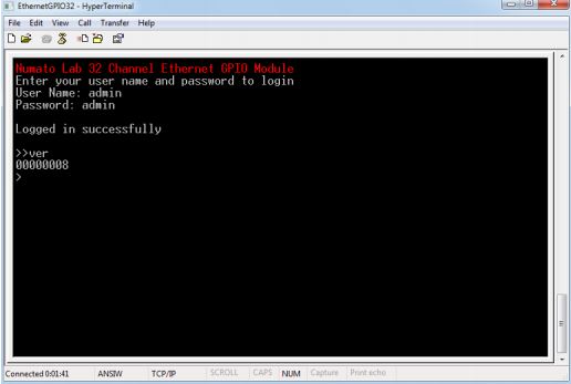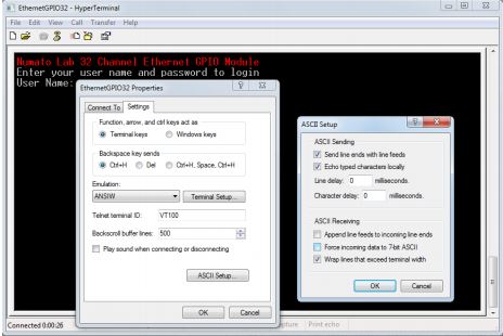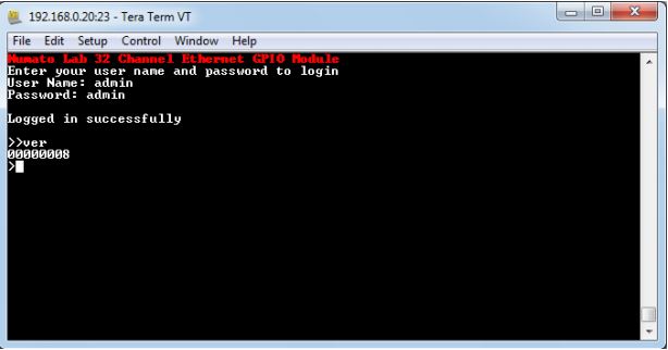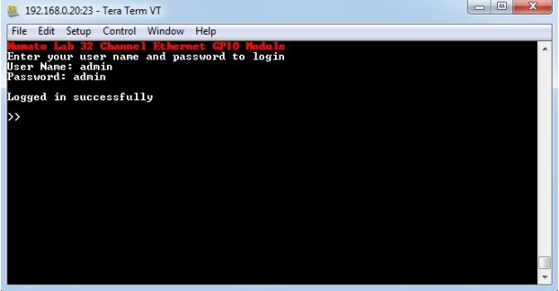The simple set of ASCII based human-readable command set supported by this module makes controlling GPIOs easy via TELNET protocol very easy. The following sections give examples of how to use the module with HyperTerminal and TeraTerm.