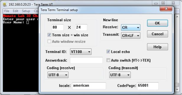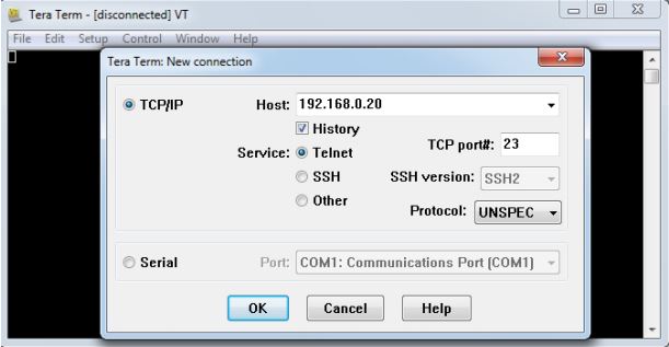 TeraTerm is an open-source software. A free copy can be downloaded from http://en.sourceforge.jp/projects/ttssh2/releases/- Run TeraTerm and type in the IP address corresponding to the module in the “New connection” dialog and click OK.