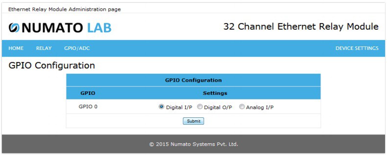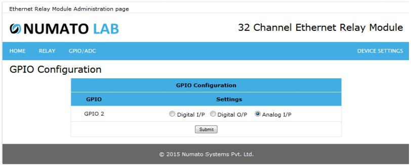 32 Channel Ethernet Relay Module does support Analog to Digital Conversion on some of the IO terminals. A list of GPIO’s that supports analog function in this product is listed elsewhere in this document. There is no special command is required to execute to switch between analog and digital mode. Executing the “adc” command will set the GPIO to the analog mode and executing the “gpio” command will set the GPIO back to digital mode on the fly. The resolution of the ADC is 10 bits unless otherwise noted. The input voltage range of the ADC is 0 – VDD (this product uses 3.3V power supply, so the range will be 0 – 3.3V). The result will be returned as a number starting at zero and ending at 1023. Zero indicates zero volts at the ADC input and 1023 indicates VDD (3.3V for this product) at ADC input.