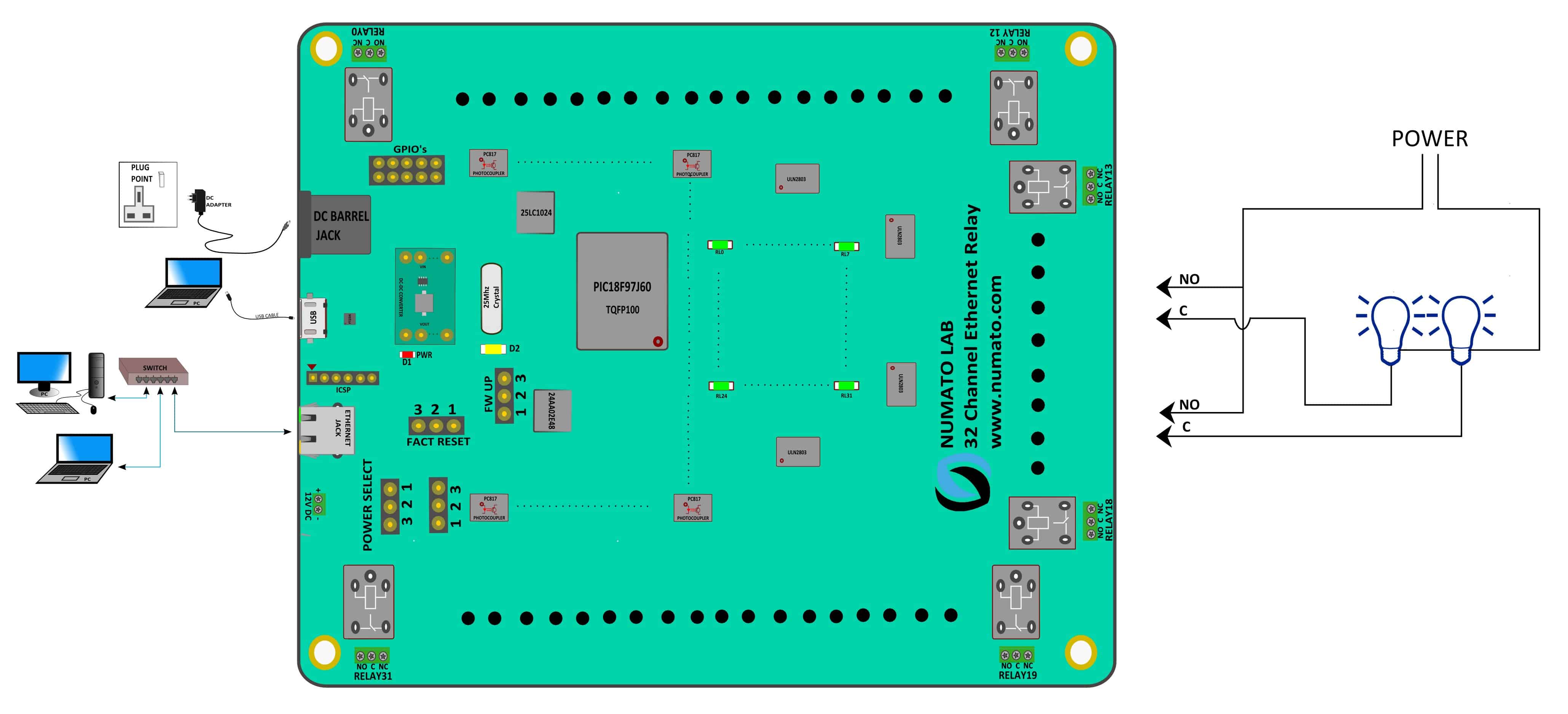 Numato Lab’s 32 Channel Ethernet Relay Module is a versatile product for controlling electrical and electronic devices remotely from a PC over Ethernet link. Ease of use and wider operating system compatibility are the primary goals behind this product’s design. This simplicity allows the use of off-the-shelf Terminal Emulation programs such as Hyper Terminal and Tera Term for controlling the module with a simple set of human-readable commands through Telnet/Web page. For power users, this module can be controlled by writing programs in various programming languages.