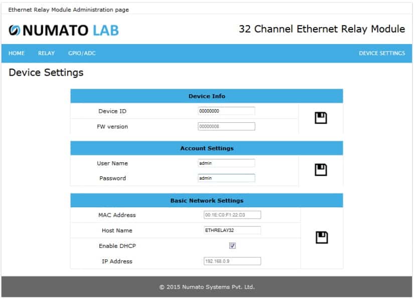 In the above image, the firmware version is displayed as 00000008, default device ID 00000000, default user name and password as ‘admin’. The user can change and save the Device ID, User name and Password as explained in command set (Page No.19) or changing the appropriate field on this page and clicking on the save button on the right side. The user name and password can be reset to factory defaults via Factory Reset explained elsewhere in this document. The Basic Network Settings Shows the Device MAC address, Host Name, and IP Address. The default hostname and IP Address can also be changed according to the user’s wish. After saving changes the board will reboot with the new network settings.