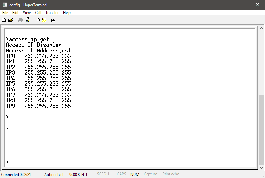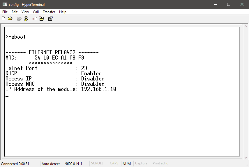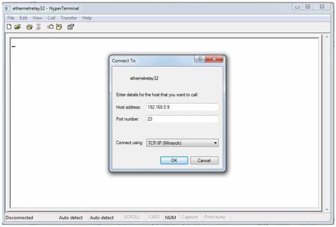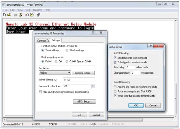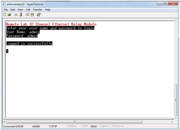 The simple set of ASCII based human-readable command set supported by this module makes controlling relays easy via TELNET protocol very easy. The following sections give examples of how to use the module with Hyper Terminal and Tera term.
