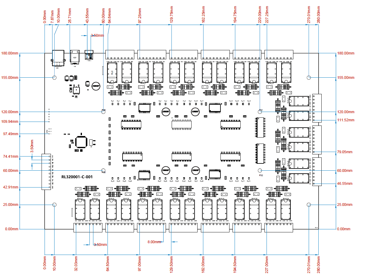 This product has thirty two on board DPST relays and associated drivers capable of controlling variety of devices including lamps, motors, locks etc… (Please see recommendations for using this product with inductive loads elsewhere in this document). This module also includes General Purpose I/Os, and analog inputs (multiplexed with GPIOs) that can be accessed over USB interface for extended functionality. The module communicates with host PC over full speed USB link. When connected to PC, the module will appear as a serial port in Windows Device Manager (or a serial tty device in Linux and Mac).