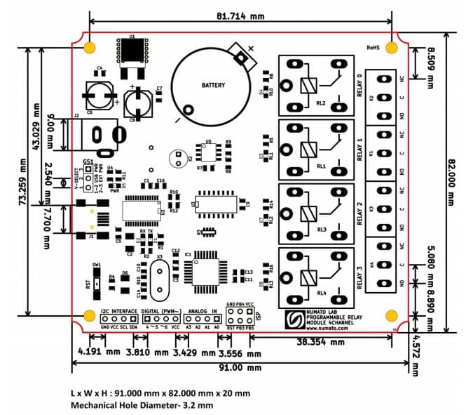 Numato Lab’s 4 Channel Programmable Relay Module is a feature-rich product that can be programmed with Arduino IDE. The USB to Serial Chip FT232RL helps to upload sketches quickly to the board. This programmability gives this board ultimate flexibility compared to other relay modules where features depend on the preprogrammed firmware and offer limited customizability. The onboard programmable relays, digital I/O’s, analog inputs, Real-Time Clock(RTC) and Micro SD memory card slot make this module useful for learning as well as making sophisticated applications.
