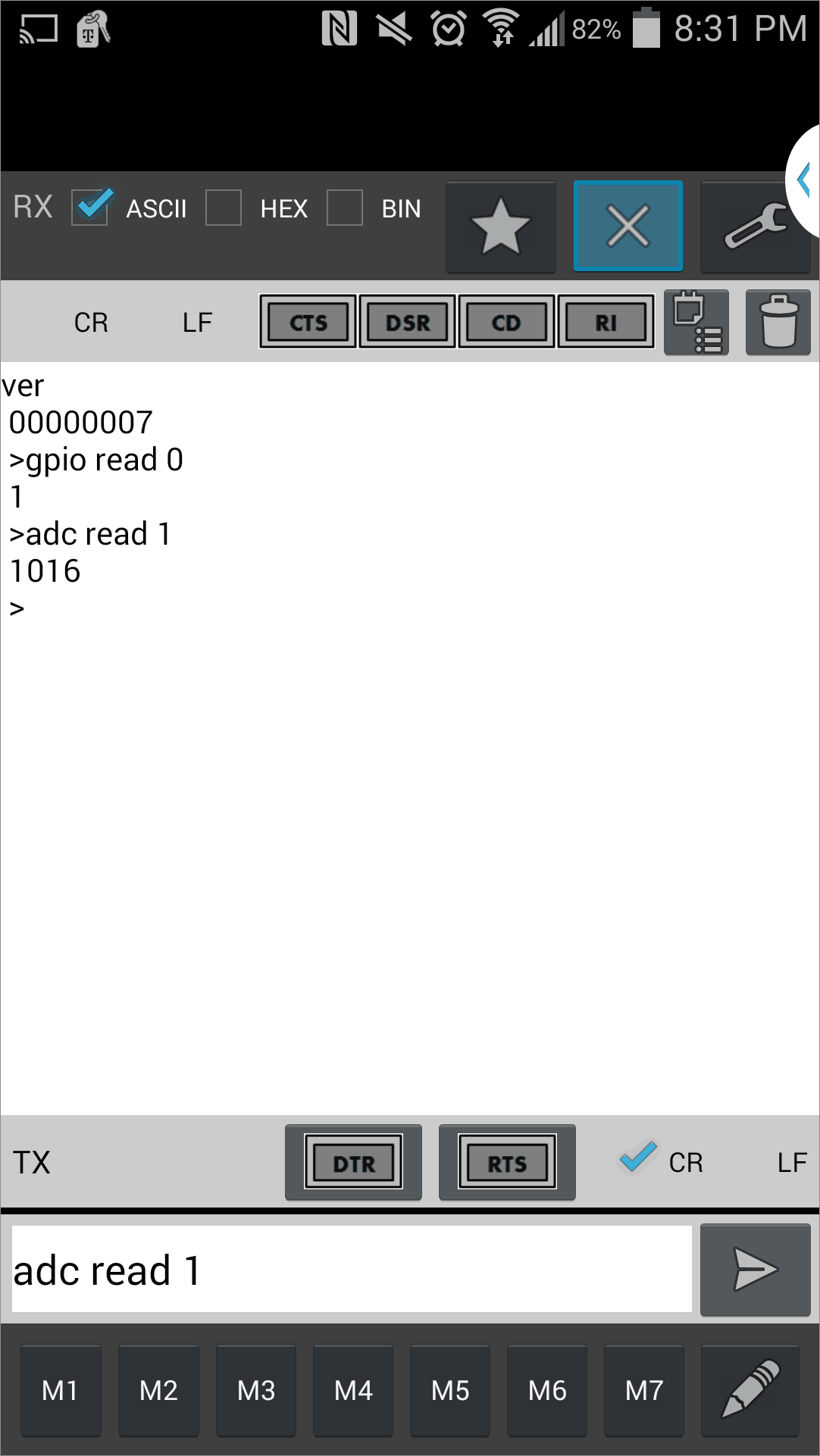 Analog inputs can be read using the same methods provided by the SerialPort module. Only the specific command needs to change and optionally parse the response from the device to extract the actual analog data. The code below shows how to send the command adc read 0 and parse the response to extract the analog data. The data we are interested is the count returned by the device. javascript’s substr() string function can be used for precise data extraction. Finally the data, which is still a string is converted to an integer by using Number() function.