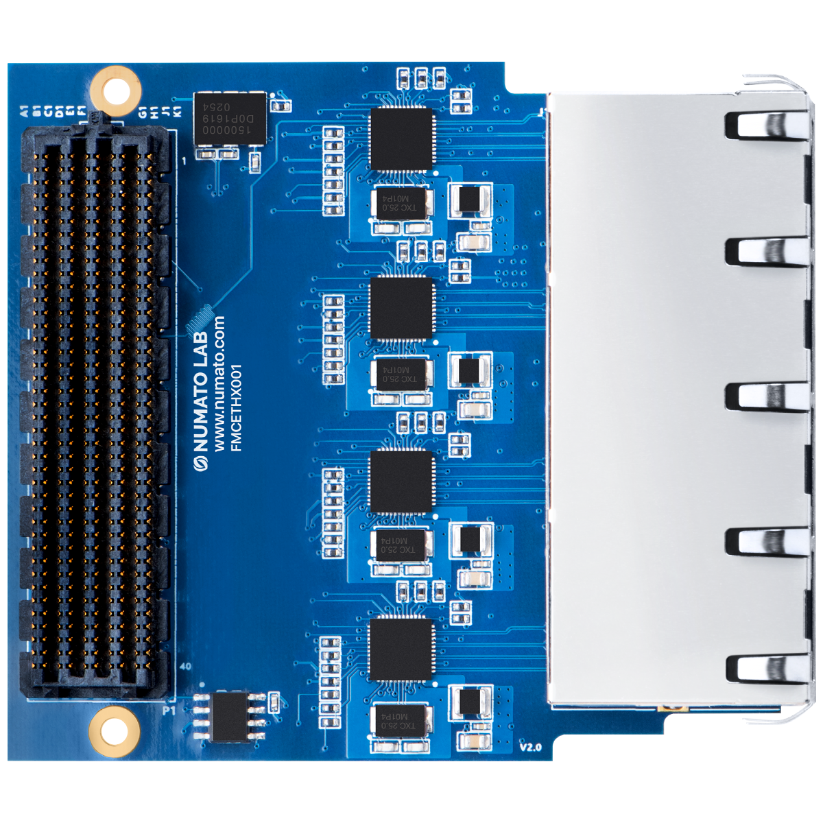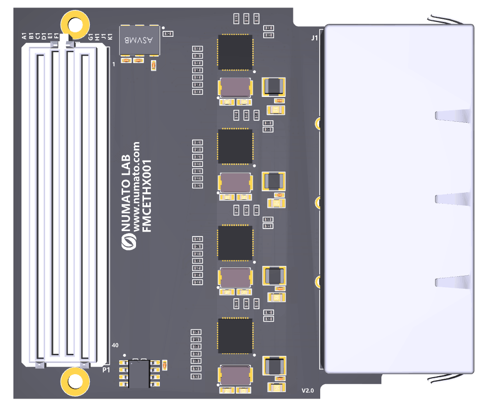 The Reduced Gigabit Media-Independent Interface (RGMII) is used to interface Ethernet MAC on FPGA with Gigabit Ethernet PHY chips (RTL8211E) on 4 Port Gigabit Ethernet FMC Module. RGMII provides a media-independent interface so that there is compatibility between MAC and PHY irrespective of the hardware used. This expansion module is compatible with Numato Lab’s FPGA boards such as Nereid Kintex 7 FPGA Board, Proteus Kintex 7 FPGA Board and Tagus Artix 7 FPGA Board.