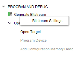Step 1: It is recommended to generate .bin bitstream file along with .bit bitstream file. Right Click on “Bitstream Settings”.