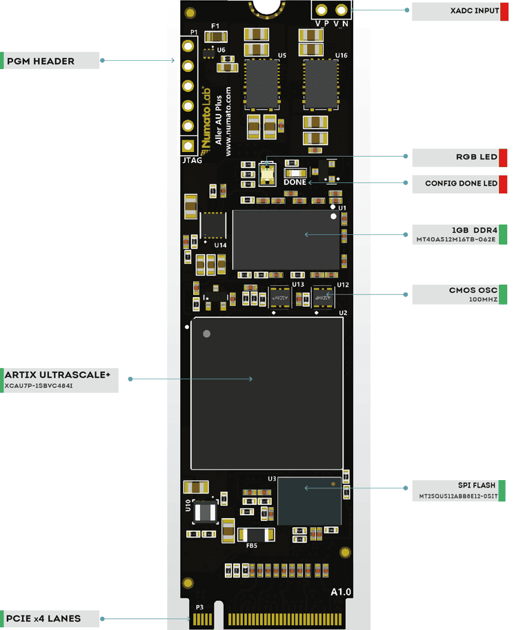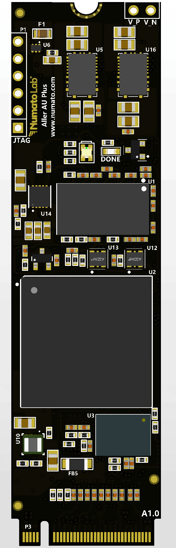 The Aller AU-Plus FPGA Module is a high-performance development platform featuring an Artix Ultrascale+ FPGA, optimized for advanced computing and high-speed data processing. Equipped with an M.2 interface, SPI flash, DDR4 memory, and a TPM (Trusted Platform Module) for enhanced security, this board is ideal for applications requiring speed, security, and flexibility. The M.2 interface enables seamless integration with SSDs and other expansion modules, making it a versatile choice for embedded systems, data acquisition, and AI edge computing.