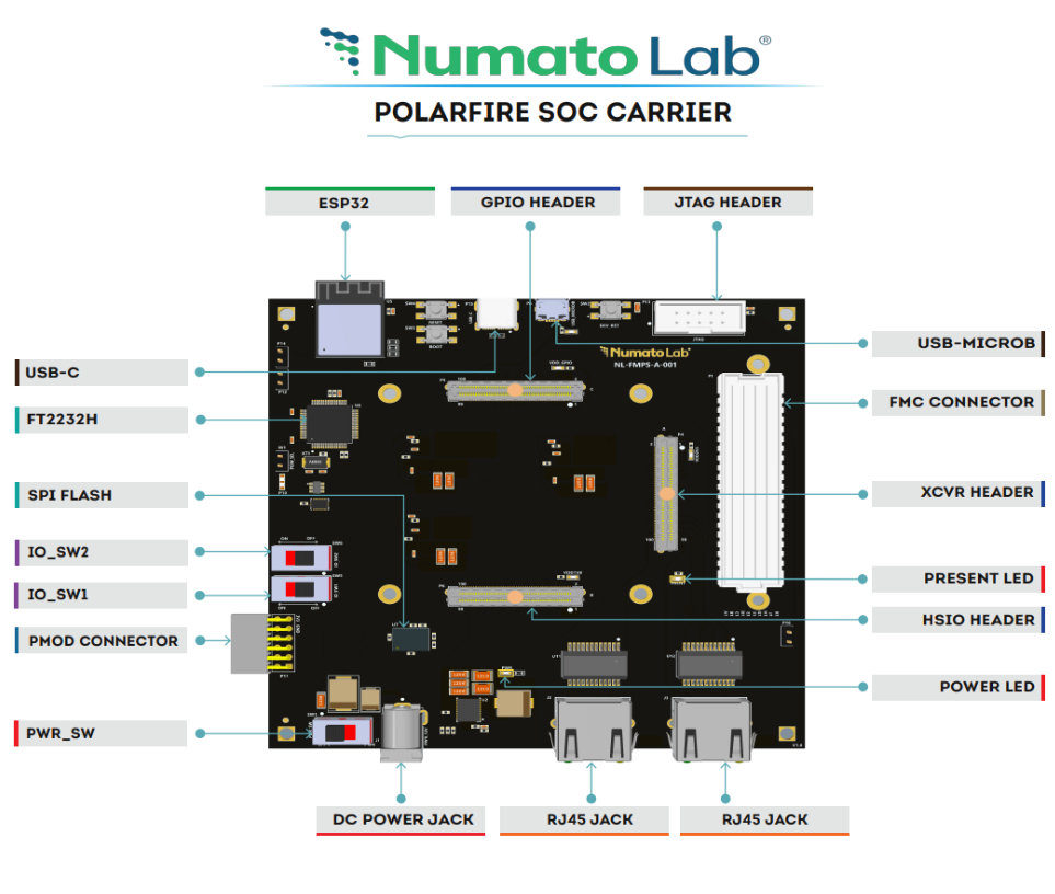 The EagleCore PolarFire SoC SOM Carrier is equipped with Samtec Razor Beam LSHM Series connectors, allowing seamless integration with Microchip SOM modules, including the EagleCore PolarFire SoC. It also features a High Pin Count (HPC) high-speed FMC connector with four SERDES lines, enabling the expansion of the board’s capabilities through custom or off-the-shelf daughter boards. Additionally, the carrier board includes several other features aimed at enhancing functionality and providing greater flexibility for users.