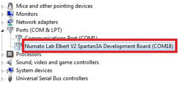 Elbert V2 has an on-board micro-controller which facilitates easy reprogramming of onboard SPI flash through the USB interface. The micro-controller receives bitstream from the host application and program it into the SPI Flash and lets the FPGA boot from the flash. The Elbert V2 configuration application can be downloaded from www.numato.com for free. When Elbert V2 is connected to PC, it shows up as a COM port in Device Manager. Run configuration application, select proper COM Port before downloading bitstream. Click on “Open File” to select the bitstream file (.bin) and press the “Program” button to download the bitstream. Wait till the download process is finished. Once the download process is over, the configuration controller will try to boot the FPGA from the SPI Flash automatically. Follow the below steps.