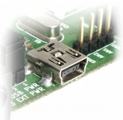 The onboard full-speed USB controller helps a Windows/Linux/Mac computer to communicate with this module. Use a USB A to Mini B cable to connect with a PC. By default, the module is powered from USB so make sure not to overcrowd unpowered USB hubs (the picture on the left shows USB Mini connector).