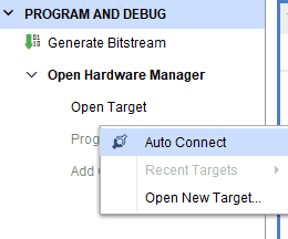 Step 2: Open Vivado project and open the target by clicking on the “Open Target” in “Open Hardware Manager” in the “Program and Debug” section of the Flow Navigator window. Select “Auto Connect”.
