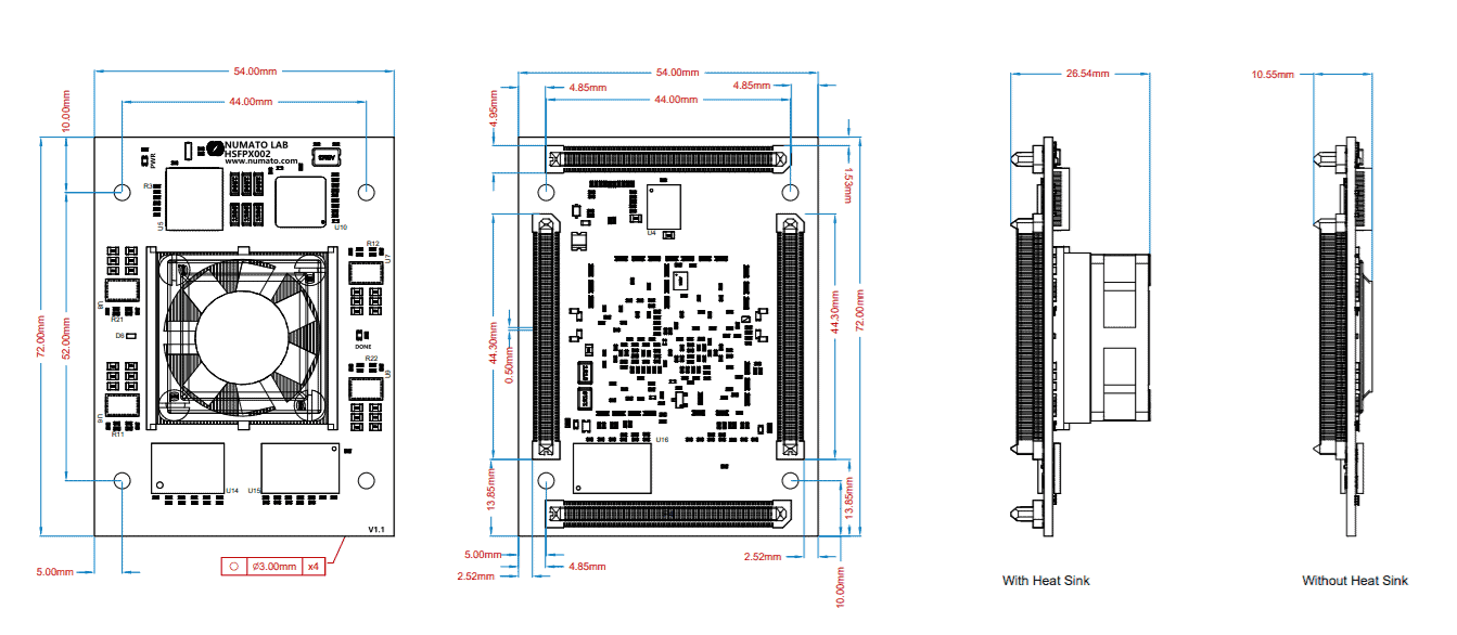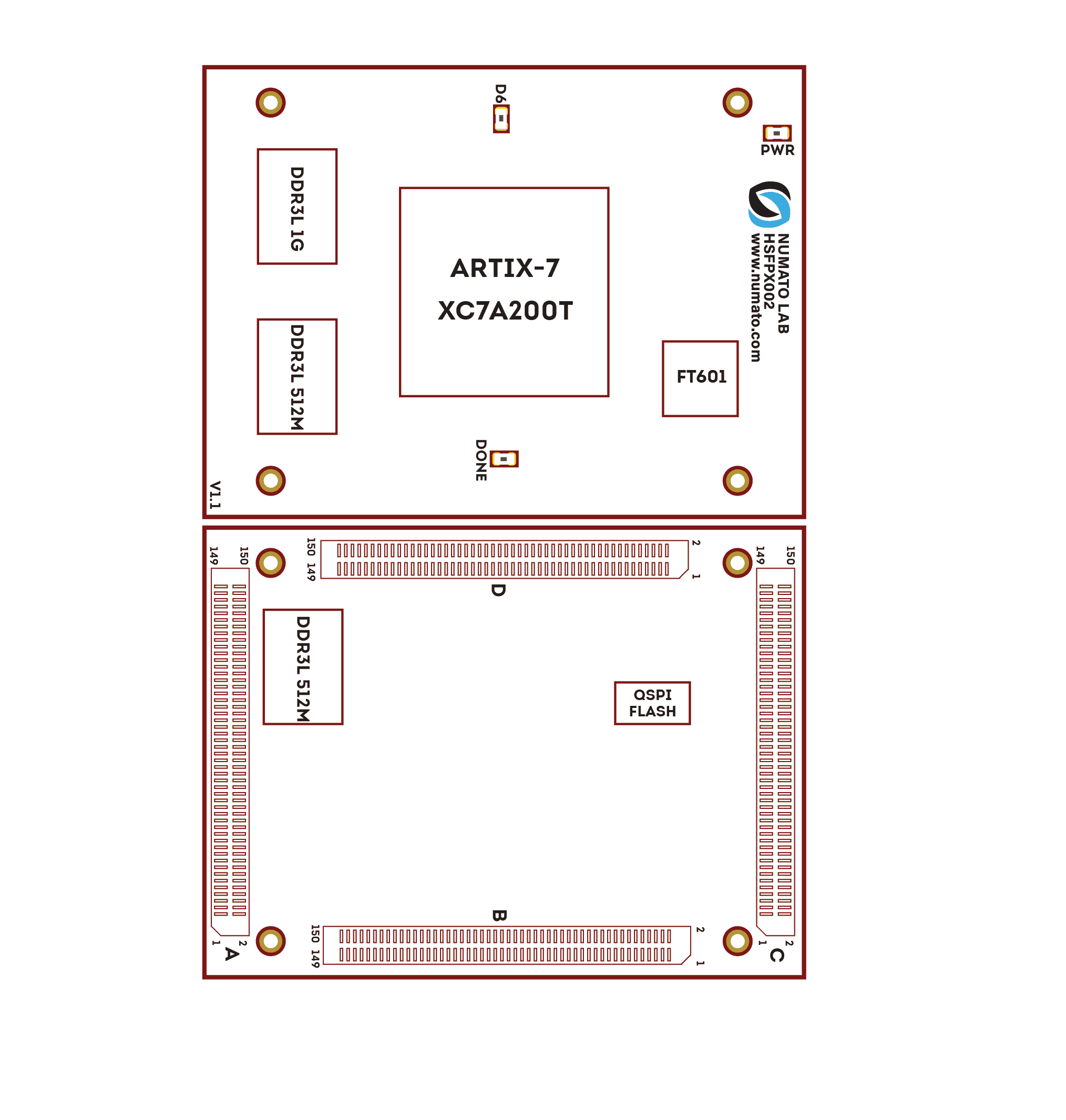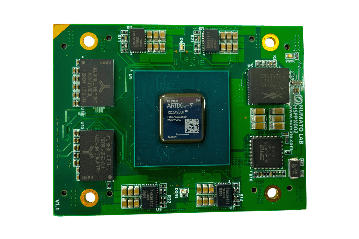 HSFPX002 is an easy to use FPGA module featuring the Xilinx Artix 7 FPGA with total size of 24Gb DDR3 SDRAM. This board contains the Xilinx XC7A200T– FBG676 FPGA. This board features an Edge Rate® Rugged High-Speed Male connector, so this board works with the carrier boards (like Numato Lab’s HSFPX00X carrier board) that feature Edge Rate® Rugged High-Speed female connectors. This board has the FT601 IC for the configuration and communication between FPGA and USB host.