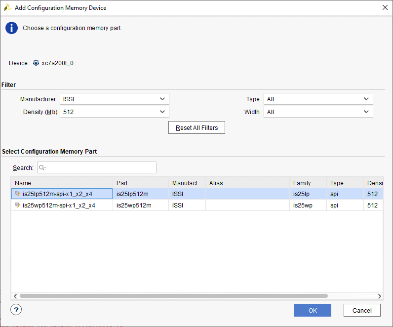 Step 3: Select the memory device “is25lp512m-spi-x1_x2_x4”, then click OK.
