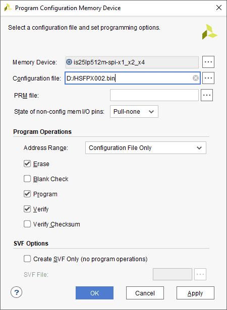 A .bin or .mcs file is required for programming HSFPX002’s onboard QSPI flash.