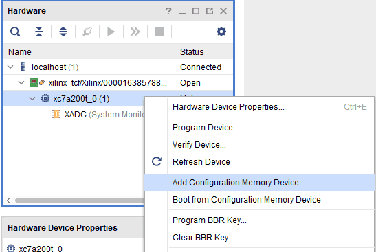 Step 2: If the device is detected successfully, it will be displayed as shown in the image below. To add Configuration Memory Device, right-click on the target device “xc7a200t_0” and select “Add Configuration Memory Device” as shown below.