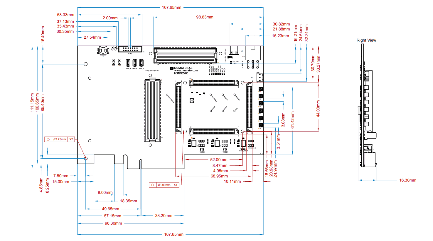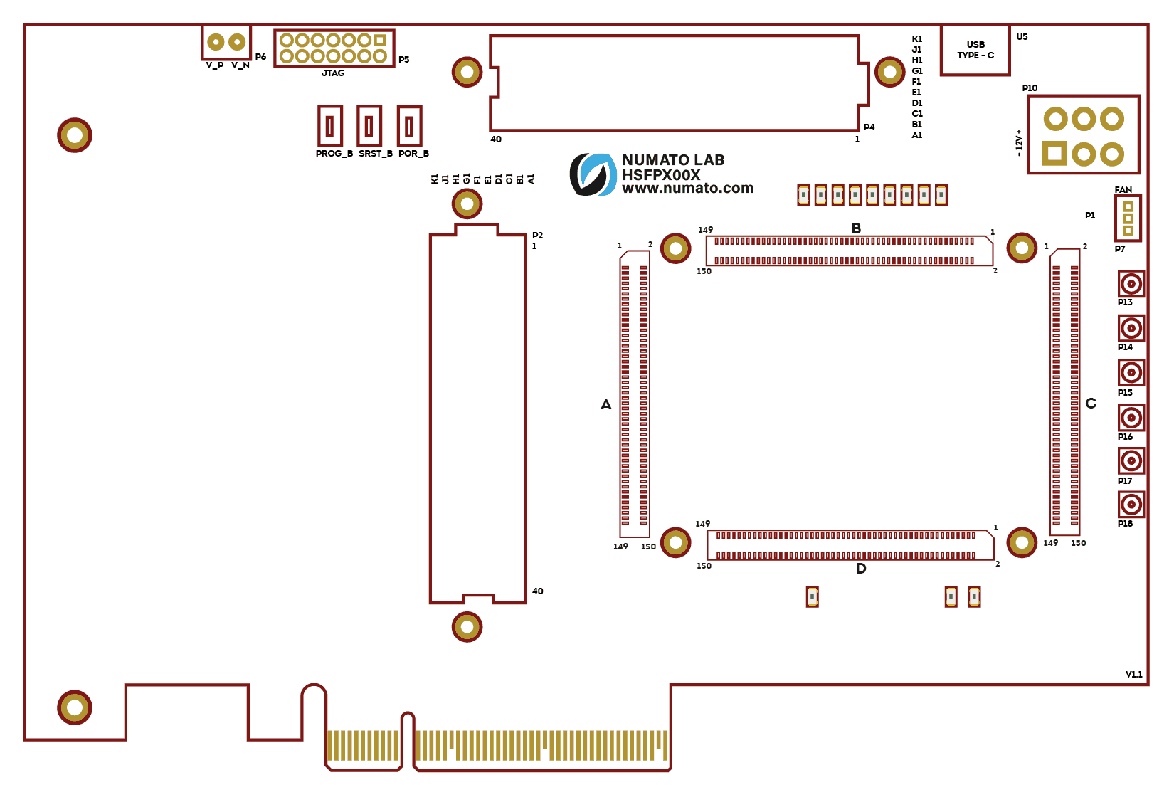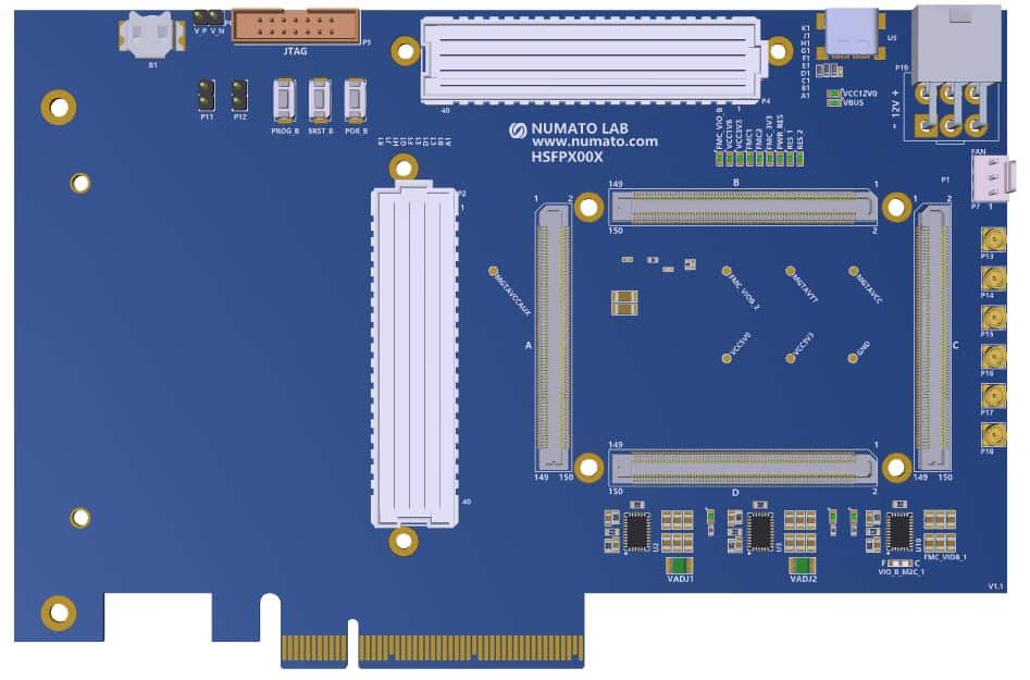 The HSFPX00X is carrier board for connecting module with Edge Rate® Rugged High-Speed Male connector like Numato Lab’s HSFPX002 FPGA module. The HSFPX00X carrier board features High Pin Count (HPC) high-speed FMC connector conforming to ANSI/VITA 57.1 Standard for the purpose of adding additional features to the board by using custom or commercial off-the-shelf daughter boards and a x8 PCIe interface.