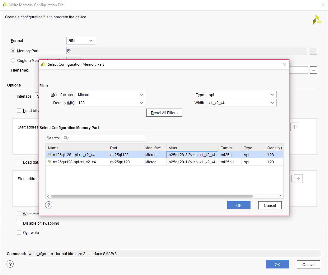 Step 3: Select the memory device “mt25ql128-spi-x1_x2_x4 (which is equivalent to n25q128-3.3v-spi-x1_x2_x4)”, then click OK.