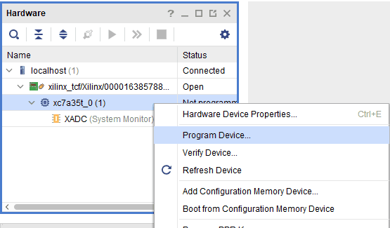 Step 3: If the device is detected successfully, to program the device, right-click on the target device “xc7a35t_0” and select “Program Device” as shown below.