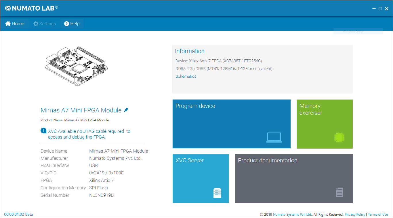 This product requires a driver to be installed for proper functioning when used with Windows. The Numato Lab Mimas A7 Mini driver can be downloaded from here. When the driver installation is complete, the module should appear in FT_Prog Tool as Mimas A7 Mini FPGA Development Board.