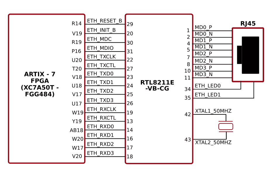 Mimas A7 Development Board features RTL8211E, a highly integrated Ethernet transceiver from Realtek that comply with 10BASE-T, 100BASE-TX, and 1000Base-T IEEE 802.3 standards. It supports communication with the Ethernet MAC layer via standard RGMII interface. RTL8211E-VB implements auto-negotiation to automatically determine the best possible speed and mode of operation. It contains a high-performance 10/100/1000T transceiver and the RGMII interface supports 1000Mbps (1Gbps) operation.