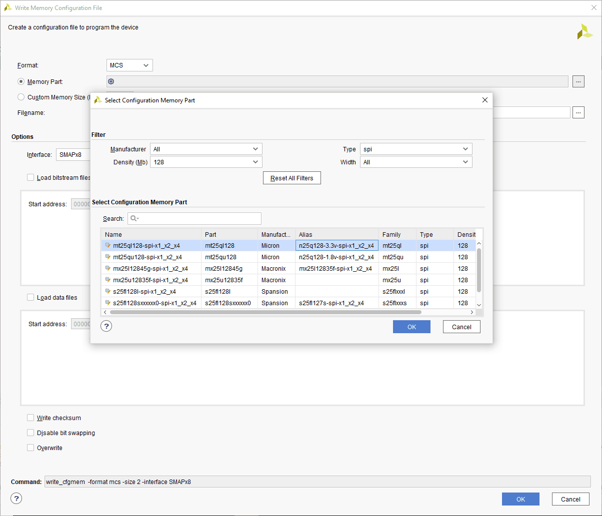 Step 3: Select the memory device “mt25ql128-spi-x1_x2_x4 (which is equivalent to n25q128-3.3v-spi-x1_x2_x4)”, then click OK.