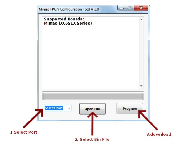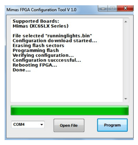 Mimas has an on-board micro-controller which facilitates easy reprogramming of onboard SPI flash through the USB interface. The micro-controller receives bitstream from the host application and program it into the SPI Flash and lets the FPGA boot from the flash. The Mimas configuration application can be downloaded from www.numato.com for free. When Mimas is connected to PC, it shows up as a COM port in Device Manager. Run configuration application, select proper COM Port before downloading bitstream. Click on “Open File” to select the bitstream file (.bin) and press the “Program” button to download the bitstream. Wait till the download process is finished. Once the download process is over, the configuration controller will try to boot the FPGA from the SPI Flash automatically. Follow the below steps.