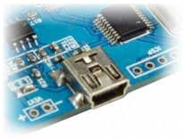 The onboard full-speed USB controller helps a Windows/Linux/Mac computer to communicate with this module. Use a USB A to Mini B cable to connect with a PC. By default, the module is powered from USB so make sure not to overcrowd unpowered USB hubs. (the picture on the left shows USB Mini connector)