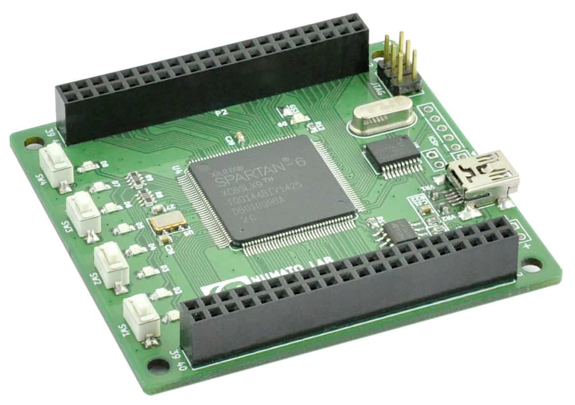 Mimas is an easy to use FPGA Development board featuring Xilinx Spartan-6 FPGA. Mimas is specially designed for experimenting and learning system design with FPGAs. This development board features Xilinx XC6SLX9 TQG144 FPGA with a maximum of 70 user IOs. The USB 2.0 interface provides fast and easy configuration download to the on-board SPI flash. You don’t need a programmer or special downloader cable to download the bitstream to the board.