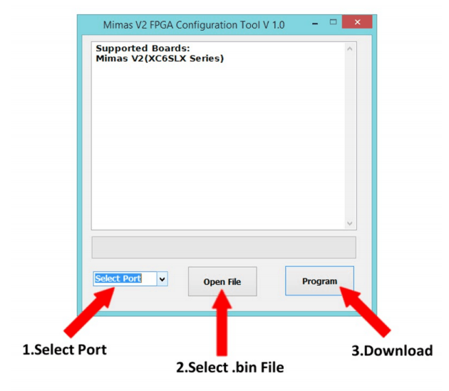MIMAS V2 has an on-board micro-controller which facilitates easy reprogramming of onboard SPI flash through the USB interface. The micro-controller receives bitstream from the host application and program it into the SPI Flash and lets the FPGA boot from the flash. The MIMAS V2 configuration application can be downloaded from www.numato.com for free. When MIMAS V2 is connected to PC, it shows up as a COM port in Device Manager. Run configuration application, select correct COM Port before downloading bitstream. Click on “Open File” to select the bitstream file (.bin) and press the “Program” button to download the bitstream. Wait till the download process is finished. Once the download process is over, the configuration controller will try to boot the FPGA from the SPI Flash automatically. Follow the below steps.
