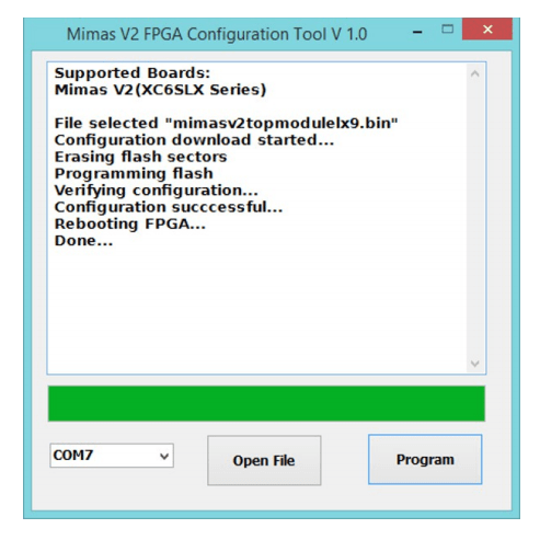 Step 1: Make sure you have selected USB configuration mode (Slide SW7 to position 1. Refer to the section “Configuration Mode Selection” for more information). Run MIMAS V2 Configuration Tool and select the correct port (Refer to section “Driver installation” for more information on finding the port number). Click the Open file button and select the .bin file.