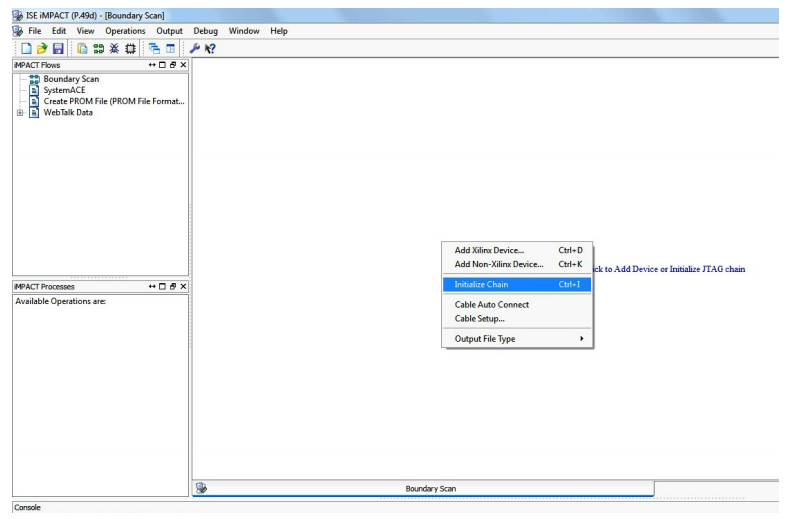 Step 1: Make sure the Xilinx Platform Cable USB is connected properly to the board. Open ISE iMPACT. Click on “Boundary Scan” in the iMPACT flows window in the left top corner. Then right-click on the window panel on the right side. Select “Initialize Chain”.