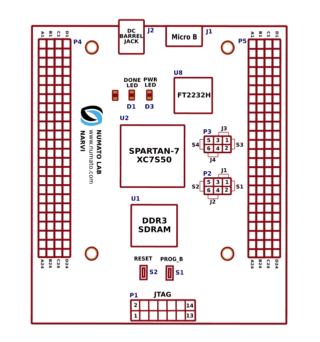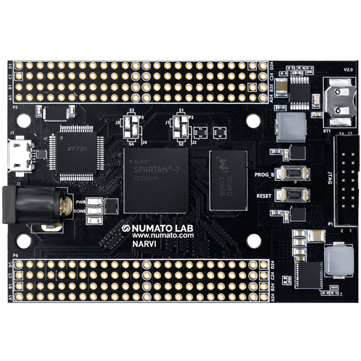 Narvi is an easy to use FPGA Development board featuring Spartan 7 FPGA (XC7S50 – CSG324A package) with FTDI’s FT2232H Dual-Channel USB device. It is specially designed for the development and integration of FPGA based accelerated features to other designs. The Narvi – Spartan 7 FPGA Board is pin compatible with Saturn Spartan 6 FPGA Module, Skoll Kintex 7 FPGA Module, Neso Artix 7 FPGA Module, Styx Zynq 7020 FPGA Module and Telesto MAX10 FPGA Module and thus offers a seamless upgrade path. The high-speed USB 2.0 interface provides fast and easy configuration download to the onboard SPI flash. No programmer or special downloader cable is needed to download the bit stream to the board. The second FTDI channel can be used to develop custom high data-rate USB based applications. Narvi provides user flexibility in adding their own peripherals through IO Expansion Headers.