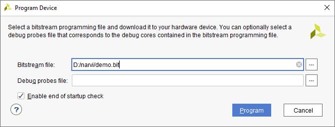 Step 4: In the dialog window which opens up, Vivado automatically chooses correct bitstream file if the design was synthesized, implemented and bitstream generated successfully. If needed, browse to the bitstream which needs to be programmed to FPGA. Finally, click “Program”.