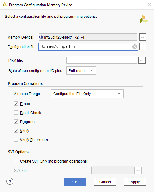 A .bin or .mcs file is required for programming Narvi’s onboard QSPI flash.