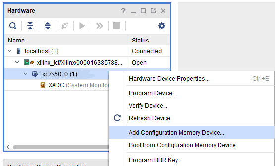 Step 2: If the device is detected successfully, then select “Add Configuration Memory Device” after right clicking on the target device “xc7s50_0” as shown below.