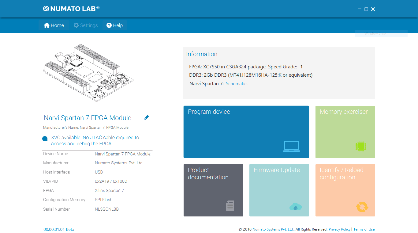 This product requires a driver to be installed for proper functioning when used with Windows. The Numato Lab Narvi S7 driver can be downloaded from here. When driver installation is complete, the module should appear in Tenagra FPGA System Management Software as Narvi Spartan 7 FPGA Module.