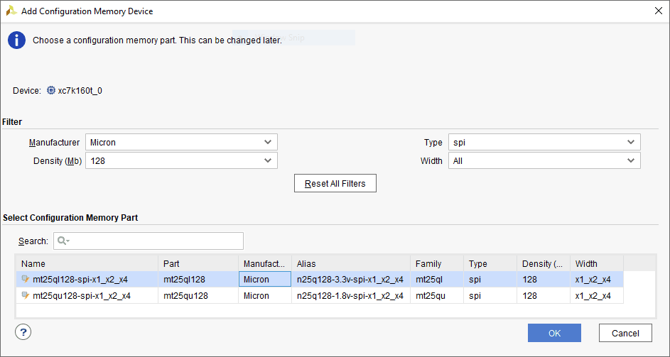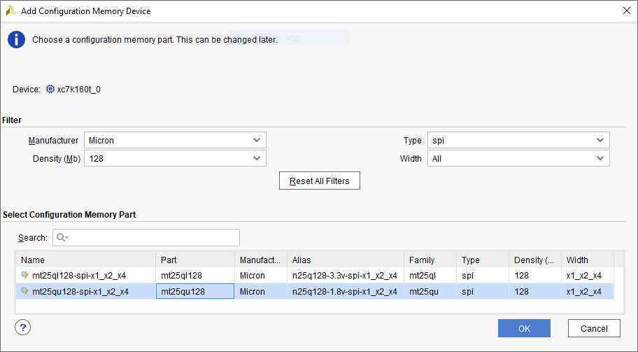 Step 3: Select the memory device “n25q128-3.3v-spi-x1_x2_x4”, then click OK.