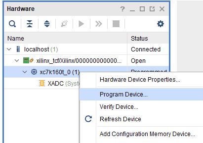 Step 3: If the device is successfully detected, then right-click on the “xc7k160t_0”. Select “Program Device” as shown below.
