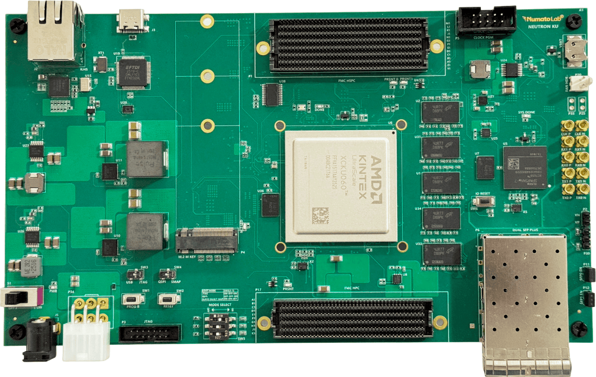 The Neutron KU60 FPGA Development Board is a high-performance platform built around the AMD Kintex UltraScale XCKU060 FPGA, designed for demanding high-speed computing, networking, and signal-processing applications. Featuring 5GB ECC-enabled DDR4, dual QSPI configuration memory, multiple clock sources, high-speed SFP+ connectivity, GTH transceiver access, and versatile expansion through FMC+ HSPC, FMC HPC, and an M.2 slot, the board delivers exceptional flexibility for advanced development. With JTAG/USB programming, and programmable clock options, Neutron KU60 provides a robust and adaptable environment for prototyping and deployment.