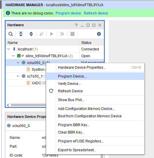 Step 4: If the device is detected successfully, then select “Program Device” after right clicking on the target device “xcku060_0” or “xc7s50_1” as shown below.