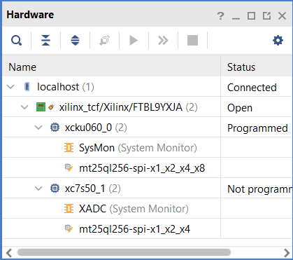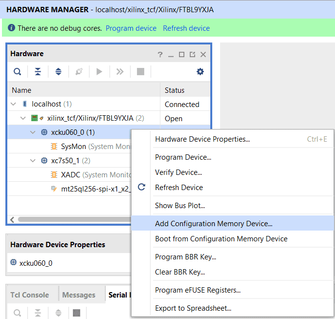 Step 2: If the device is detected successfully, then select “Add Configuration Memory Device” after right clicking on the target device “xcku060_0” or “xc7s50_1” as shown below.