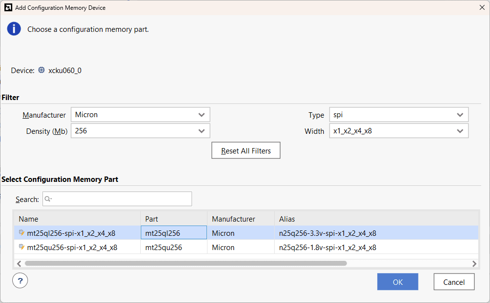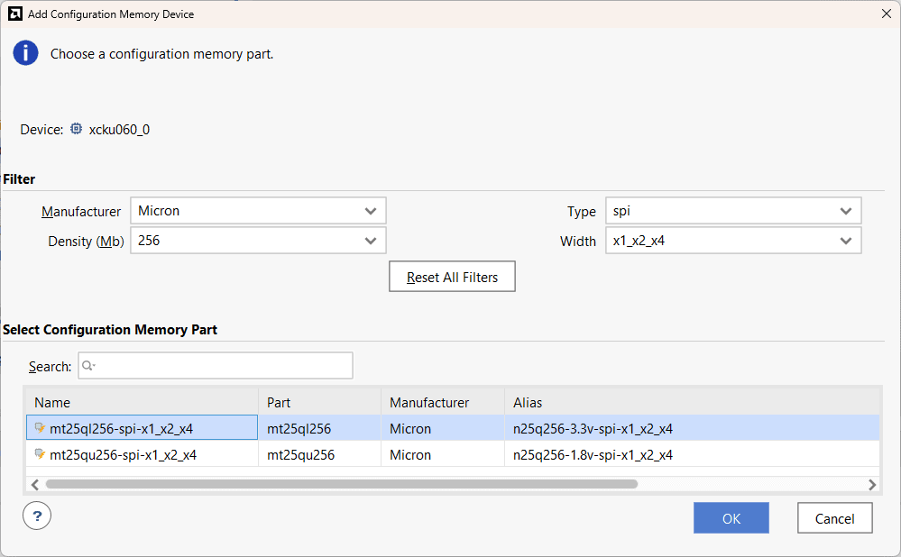 Step 3: Select the memory device “mt25ql256-spi-x1_x2_x4_x8”, then click OK.