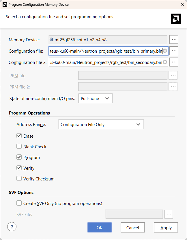 A .bin or .mcs file is required for programming Neutron KU60 onboard QSPI flash.